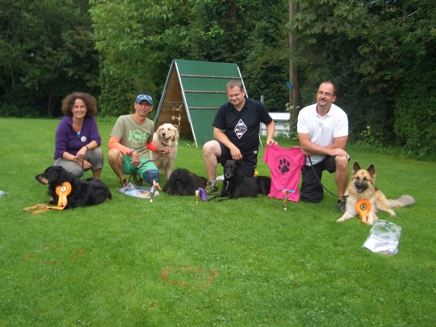 Samstag 02.08.: Statt dem von Jürgen ursprünglich erwarteten schnuckeligen kleinen Turnier hatte sich ein Teilnehmerfeld von 49 Startern angesagt, davon 29 im VK1. Die Hundeführer(innen) reichten von jungen Mädchen (ca. 10 Jahre alt) bis zu rüstigen Rentnern. Der GHV war mit Jürgen/Mandy, Richie/Sookie, Klaus/Sheila im VK1 der AK 4 (m35) vertreten sowie Beate/Berenike im VK2 der AK 5 (w50)
