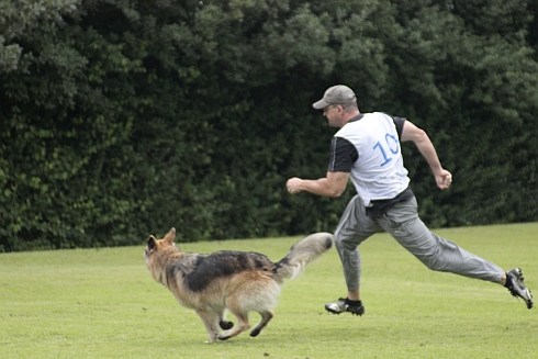 Los ging es mit der Unterordnung und da war Klaus LR Mauermeier zugeteilt, der in einem der letzten Turniere in seiner Laufbahn mit angenehmer Art und leistungsgerecht richtete. Sheila zeigte weitgehend eine konzentrierte Leistung mit nur wenigen unsauberen Elementen (Nachhängen bei einer Kehrtwende und Schiefsitzen in der abschließenden Grundstellung nach Heranrufen aus dem Platz), was unserem Team am Ende eine 57er UO einbrachte. Das abschließende Lob des LR „Saubere Leistung für einen Hund im VK1.“