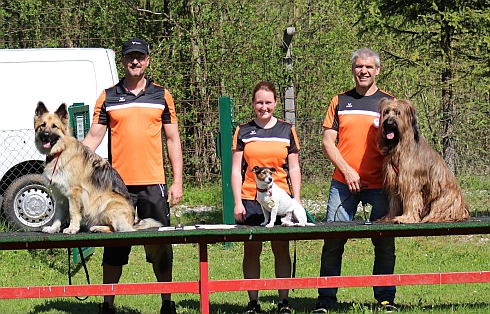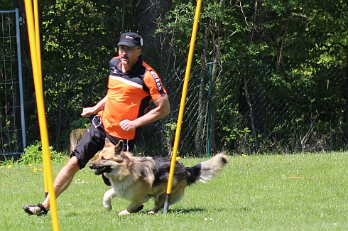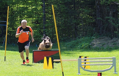 Martin hatte von Anfang an damit zu kämpfen, dass Dhuri sehr unaufmerksam in die UO ging. Sie hing nach, führte Richtungswechsel zögerlich aus und war auch bei den technischen Übungen unkonzentriert. Beim „Sitz“ brauchte sie mehrere Sekunden, den Vorsitz beim Platz konnte man mit gutem Willen als zögerlich bezeichnen und beim Hereinrufen nach dem „Steh“ waren Markierungslinien so interessant, dass man an ihnen schnüffeln musste. 44 Punkte blieben damit nur noch übrig. In den Laufdisziplinen entwickelte Dhuri dann ihre Aufmerksamkeit. Auf der ersten Bahn des Hürdenlaufes klappte es noch nicht so gut, was mit einmal 2 FP wg. Vorprellens gewertet wurde, dann aber funktionierte das Teamwork wieder (10,99). Der Slalom war sehr schön anzuschauen, Dhuri wartet in den Toren genial bis Martin ebenfalls durchlief, die Zeiten konnten sich auch sehen lassen (13,62 u. 13,54). Beim Hindernislauf ist der Laufdiel zu erwähnen, dort zögert die Briard-Hündin immer ein wenig, weshalb Martin dort auch immer besonders anspornt. An diesem Tag klappte es tadellos in beiden Läufen (11,73 u. 11,44), insgesamt kamen 261 Punkte für die Beiden raus.