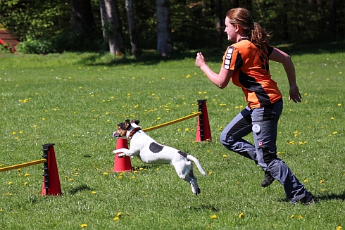 Jenny und Dana hatten zum Einstieg den Hürdenlauf vor sich. Bis zur Wendestange sah das gut aus, dort verlor Jenny den Kontakt zu ihrem Terrier, der erstmal bellend ein wenig geradeaus weiterlief. Dann drehte Dana zwar um, wollte sich aber nicht mehr an der Hundeführerin orientieren. Das führte zum einem Vorprellen an Hürde 3 und bei der letzten Hürden zog sie nicht nur vor, sondern sprang so früh ab, dass sie mit dem Bauch auf der Hürde landete und sie riss (13,90, 6 FP). Die folgende UO lief für Danas Verhältnisse gar nicht schlecht, immerhin war sie wesentlich aufmerksamer als noch beim Turnier in Dachau. Dennoch muss sie zwischendrin immer wieder mal angesprochen/motiviert werden, was eben entsprechende Abzüge bringt. Beim „Sitz“ schmiss sich Dana in ein schönes „Platz“ und beim Herankommen aus der Platzablage ist auch noch Luft nach oben drin. Ergebnis auch hier – 44 Punkte. Insgesamt war Dana aber gut aufgelegt, beim Slalom klappte alles (14,15 u. 13,92) und dass beim Hindernislauf einmal eine Stange beim Hoch-Weit riss, kommt bei Dana ja auch im Training immer wieder vor (14,50 u. 14,85/1). Gesamtergebnis 241 Punkte.